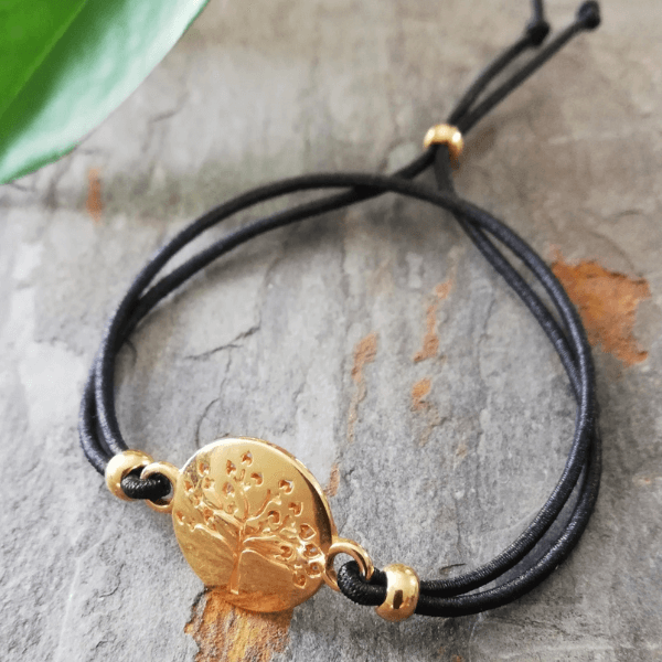 Dit elastische armbandje met de betekenisvolle golplated levensboom is eenvoudige te verstellen qua maat, dus hij past altijd.