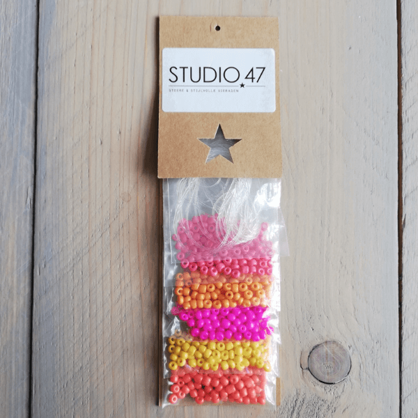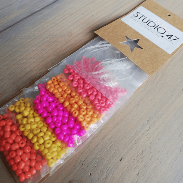 TIP: bestel er meteen een handig kralenrijgbord bij. Hiermee rollen de kralen niet van tafel en je kunt de kralen een in een mooie rijgvolgorde op klaar leggen.
