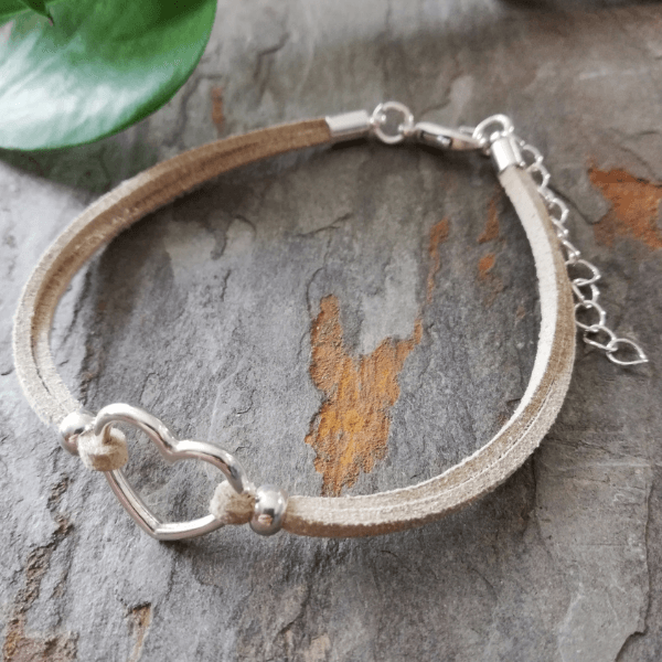 Stoer cremekleurige armbandje van imitatie suede veters en een lief hartje. Het creme combineert als basis prima bij heel veel andere kleuren, maar ook in een set armbanden van verschillende bruin- en/of zandtinten misstaat hij niet.