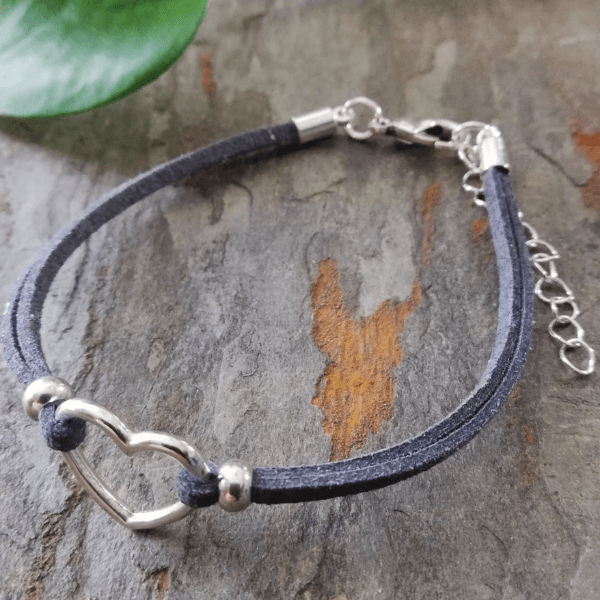 Een heel mooi donkergrijs armbandje van imitatie suede veters en een lief hartje. Het donkergrijs combineert prima bij heel veel andere kleuren, maar ook in een set armbanden van verschillende grijs tinten misstaat hij niet.
