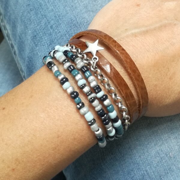 Wat een gave combinatie: blauw met cognac. Superstoer! De wikkelarmband bestaat uit drie losse armbanden die je aan elkaar koppelt. De drie armbanden zijn ook los van elkaar te dragen.